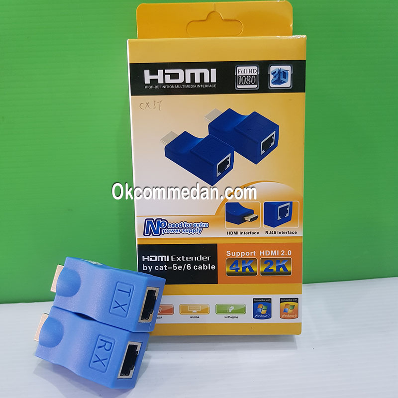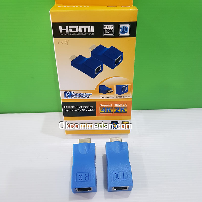 HDMI Extender dengan kabel Lan cat5 / cat6e ini adalah sepasang alat perpanjangan HDMI dimana ditengah dari alat perpanjangan ini dipasang 1 bh kabel Lan Cat 5e atau Cat 6e.