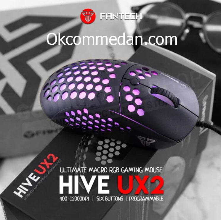 Mouse Fantech HIVE UX2 memiliki 6 tombol dengan resolusi 400- 12000 dpi dan memiliki onboard memory .