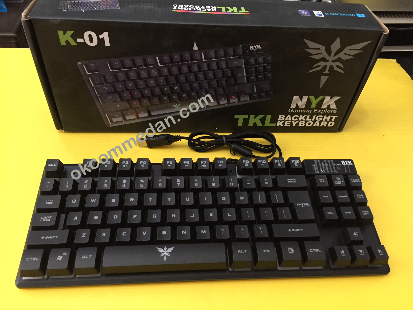 Keyboard Gaming NYK K01 ini merupakan keybaord gaming yang memiliki ukuran yang agak kecil dari keyboard biasanya. Keyboad gaming NYK K01 merupakan keyboard gaming TKL (Tenkeyless) ini memiliki nuts ultra durable dan perfect keys serta bonus 8 keycaps warna orange sebagai pengganti + pinset ( pencabut keycaps), Keyboard ini menggunakan dasar plat besi dengan kabel yang sudah braided.