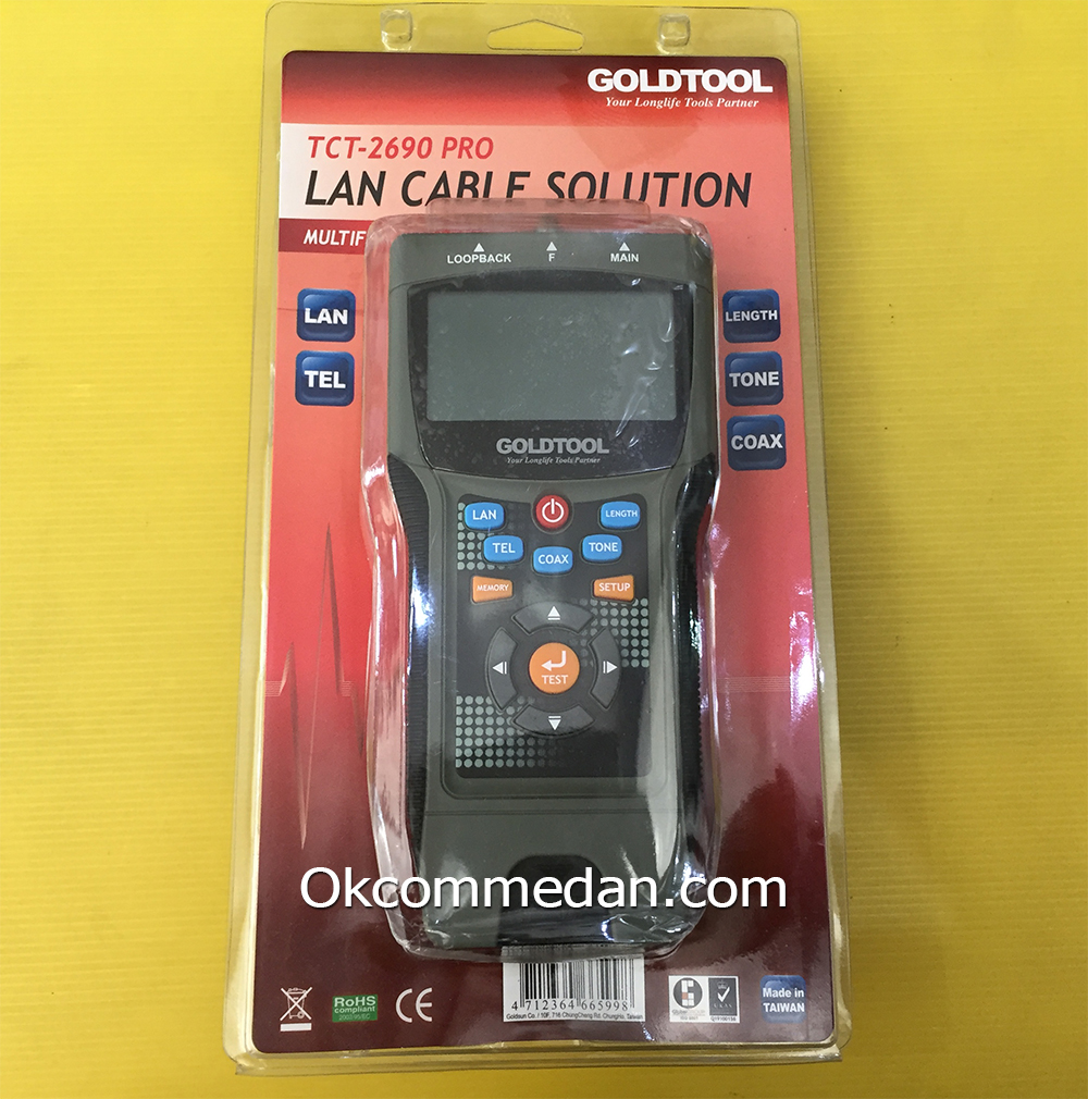 Gold Tool TCT-2690 pro adalah Suatu alat tester yang dapat mengecek cabel UTP dan STP Cat5 , Cat6, Cat6 dan Coaxial kabel . Alat ini dapat mengecek dan mengidentifikasi jarak dari open atau short circuit sehingga kita dapat mendeterminasi kontinuitas dan wiring dari susunan cabelnya .