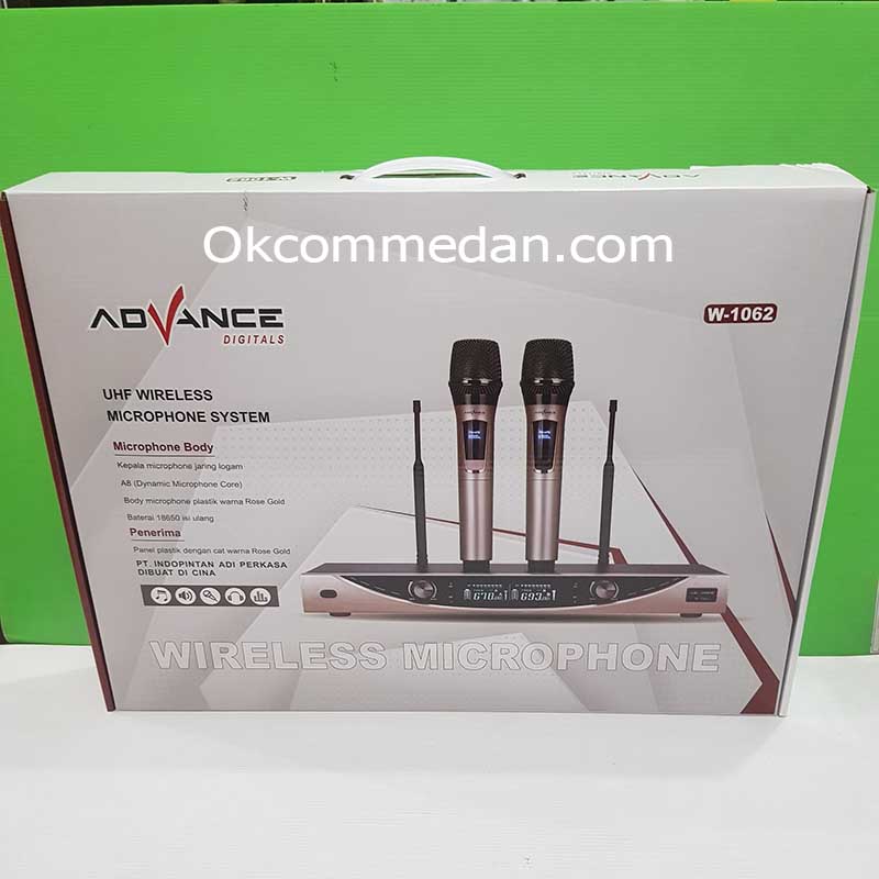2 bh Microphone Wireless dari Advance W-1062 ini kepala mic nya terbuat dari jaring logam AB ( Dynamic Microphone Core ) dan Bodynya terbuat dari bahan plastik dengan warna rose gold. Microphone ini dapat dipakai sampai dengan jarak 50 mtr dari receivernya.