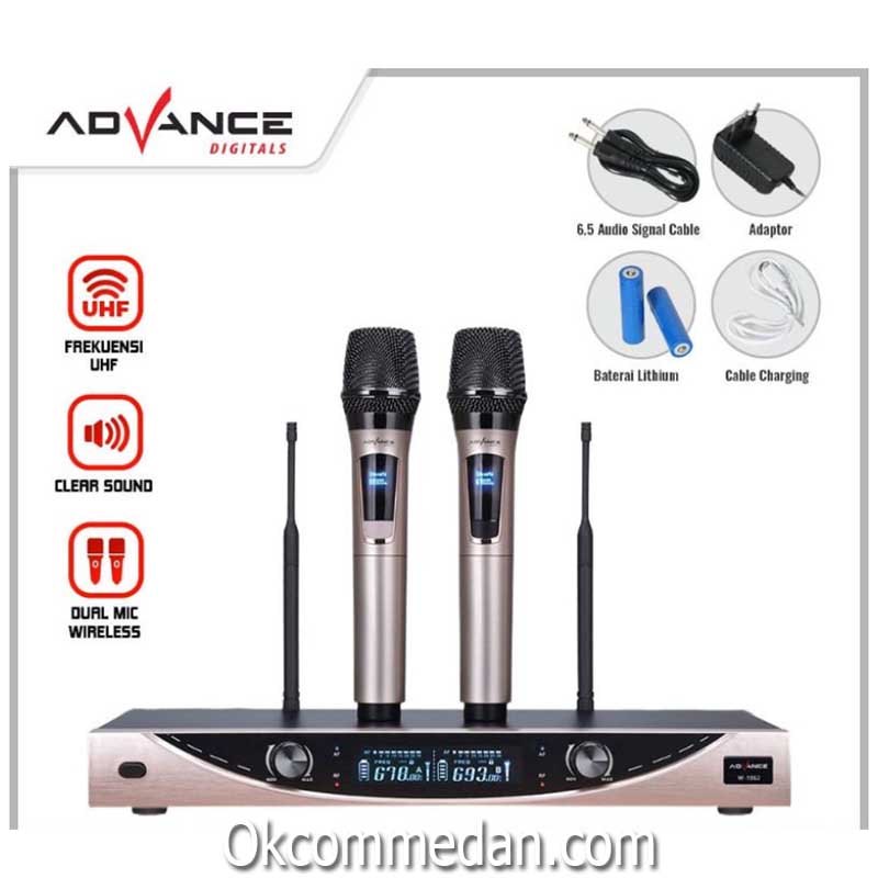 Advance W-1062 merupakan satu set Receiver dengan 2 bh wireless microphone yang menggunakan baterai rechargeable 18.650 mAh.