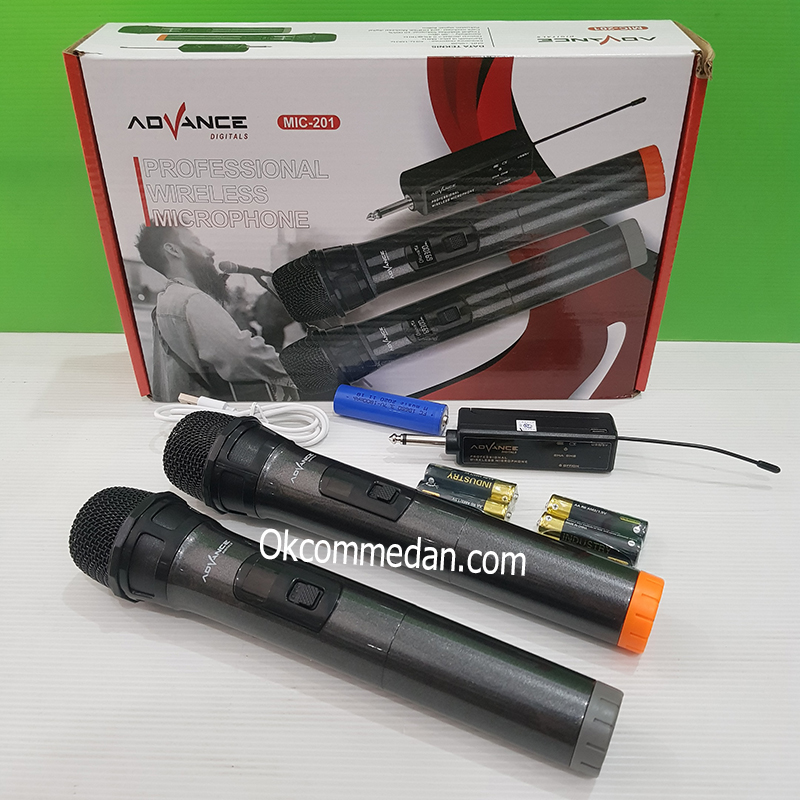 Advance MIC-201 adalah Satu set microphone wireless yang terdiri dari 2 bh mic wireless dan dilengkapi dengan sebuah receiver dengan interface Jack 6,5mm jantan , dan Receiver ini dilengkapi baterai lithium dengan kapasitas 1800 mAh.