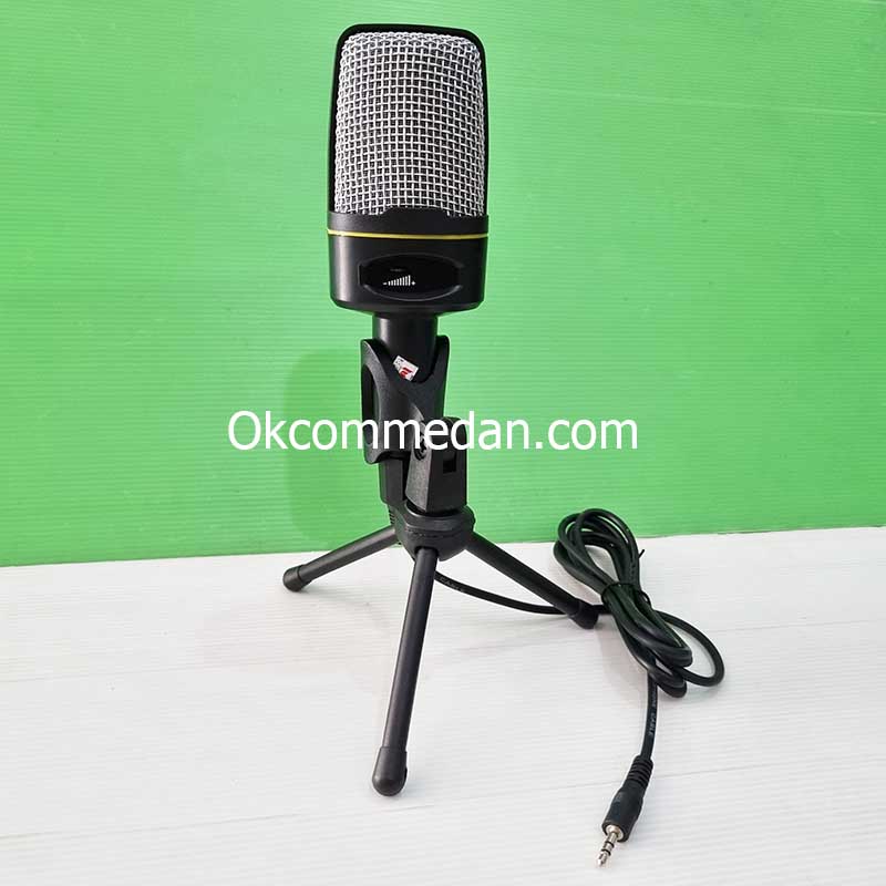 Microphone Condenser dengan setelan volume ini dilengkapi dengan tripod untuk dapat berdiri dimeja dan memakai interface jack audio 3,5 mm dengan panjang kabelnya 1,8 meter.