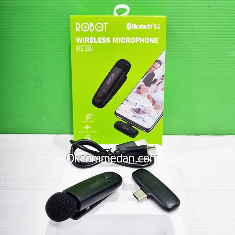 Robot RS-20 adalah Wireless Microphone untuk smartphone , yang terdiri dari sebuah bluetooth receiver untuk dihubungkan ke Smartphone dengan interface USB Tipe-C dan Sebuah Microphone dengan model Clip on pada baju kita dengan menggunakan koneksi Bluetooth .