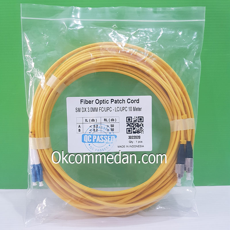 Fiber Optic Patch Cord Single Mode dengan Konektor FC – LC ini adalah seutas kabel fiber optic dengan kabel jenis single mode yang memiliki panjang 10 meter dimana pada ujung ujungnya telah dipasang konektor jenic FC dan LC dan kedua ujung konektornya tleah dipoles dengan bahan UPC .
