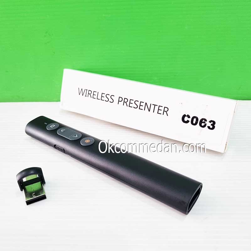 Wireless presenter dengan kode C063 adalah alat yang dapat digunakan untuk membantu kita melakukan presentasi secara wireless ( tanpa kabel ) dan dilengkapi dengan USB Wireless receiver dengan interface USB Tipe-C dan USB Tipe-A .