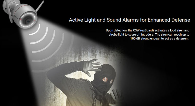 IP Camera Ezviz CS-CV310 dapat mengeluarkan suara sirene dan lampu untuk mengusir pencuri maupun obyek yang tidak diinginkan . Suara yang dikeluarkan dapat mencapai 100 dB sehingga dapat menakuti pencuri.