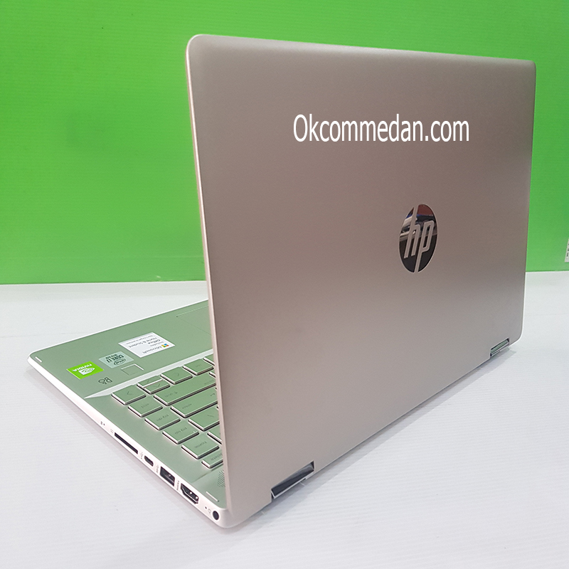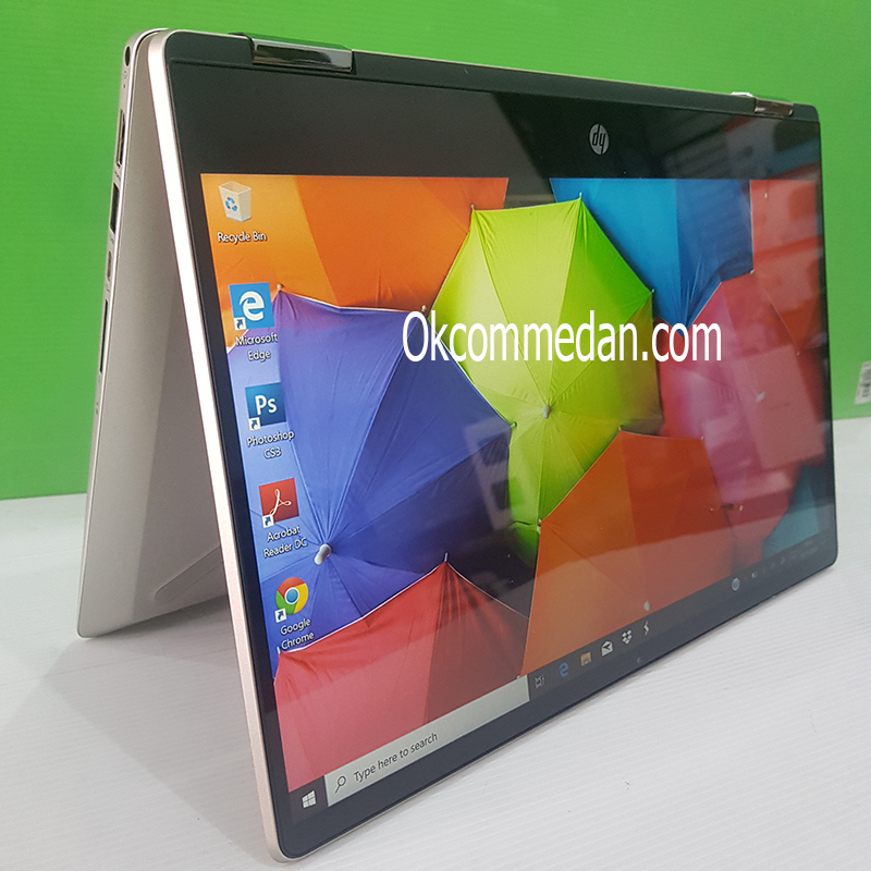 Laptop HP Pavilion X360 -14-dh1054tx menggunakan engsel 360° , sehingga layar dapat dilipat 360° dan dapat kita pakai seperti tablet dan digunakan untuk menggambar ataupun dapat kita berdirikan seperti tenda dan dipakai untuk menonton film, maupun dipakai seperti laptop biasa.