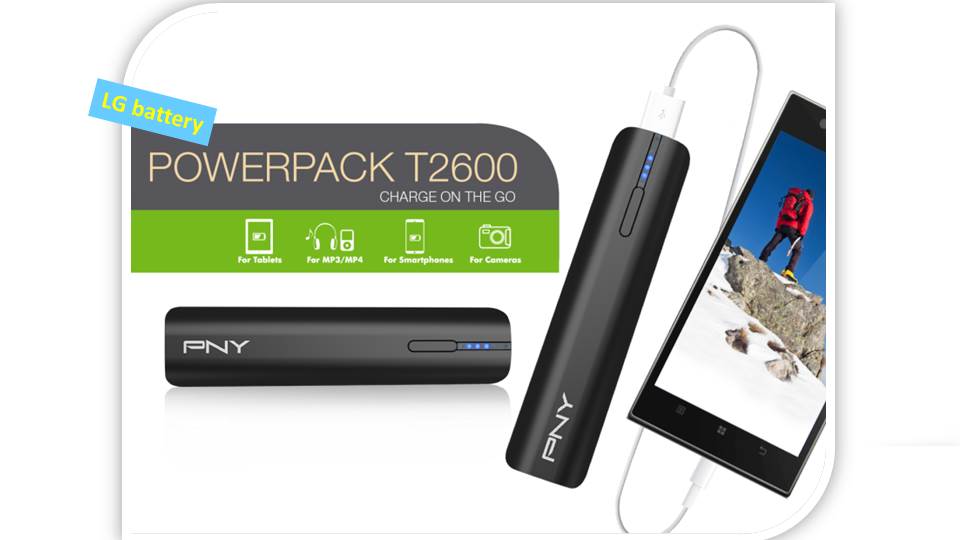 Powerbank PNY T2600 ini menggunakan baterai Lithium LG dengan kapasitas baterai 3.7 V 2600mAH, dengan ukuran yang sangat kecil ini tentunya sesuai juga dengan kapastiasnya hanya mempunyai 1 port input 5V 1A dan 1 port output 5V 1Ajadi hanya bisa dipakai untuk mencharge 1 gadget ataupun smatrphone.