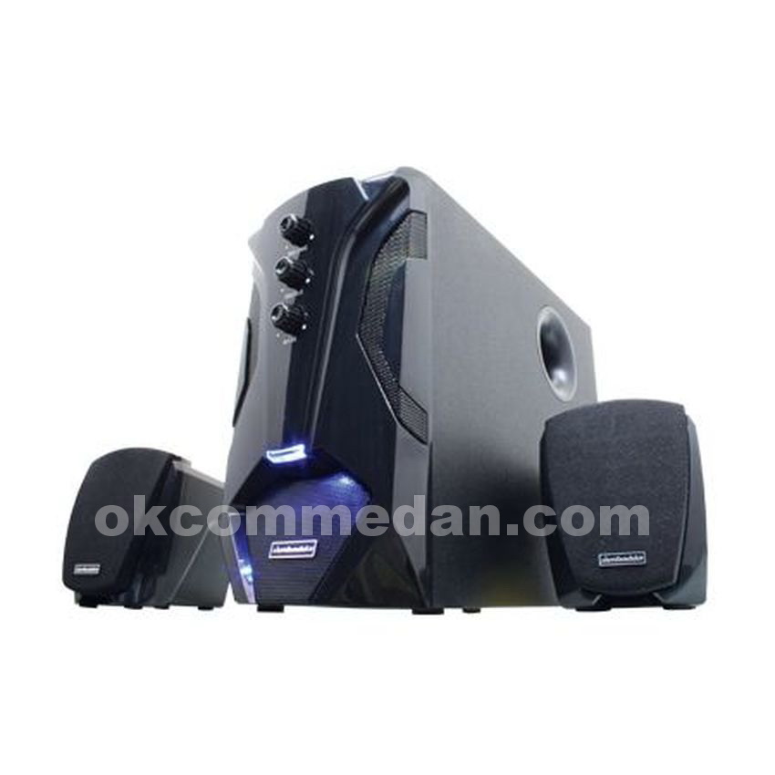 Speaker ini memiliki lampu pada subwoofer sehingga membuat speker ini nampak lebih cantik disamping suaranya yang bagus.