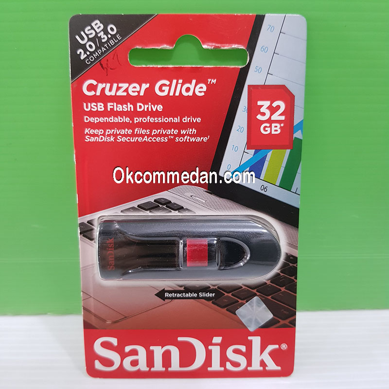 Sandisk Cruzer Glide Flash drive 32 Gb adalah Flash drive model sorong dengan kapasitas 32 Gb dengan interface USB 2.0 . Kepala USB flash disk ini dapat disimpan dan dikeluarkan dengan disorong terlebih dahulu , sehingga kepala USB dapat tersimpan dengan aman sewaktu kita tidak menggunakannya.