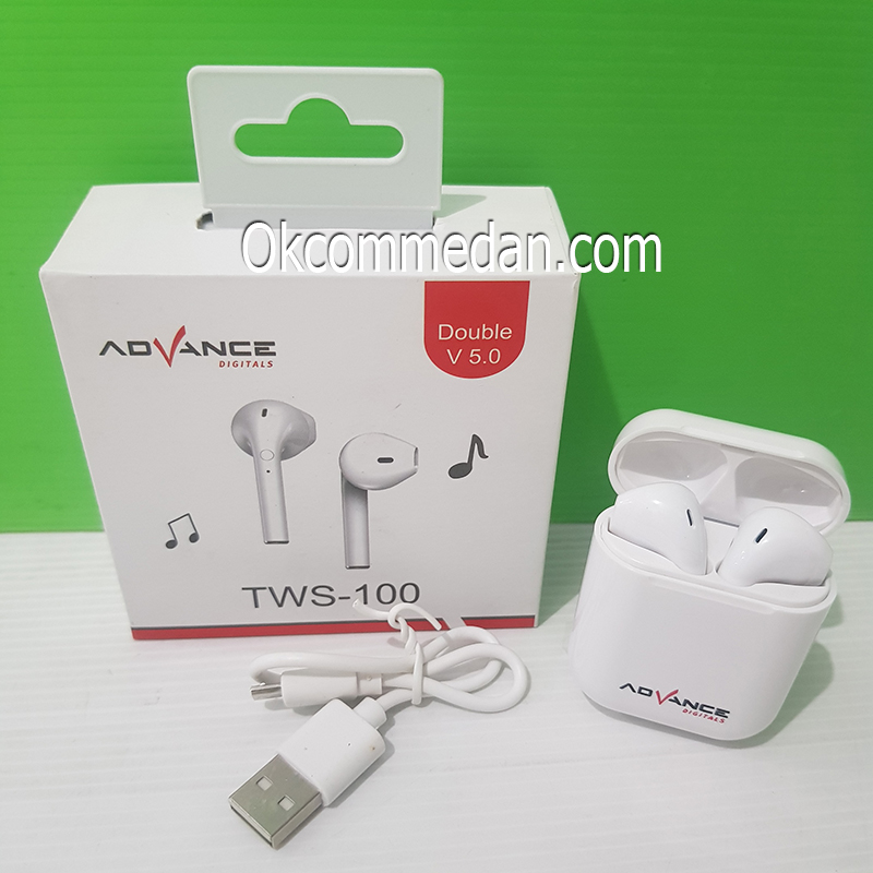 Advance TWS-100 adalah earphone dengan bluetooth versi 5.0 + EDR dan pada earphone ini dilengkapi dengan baterai 30mAh , sedangkan pada tempat penyimpanannya memiliki baterai 250 mah.