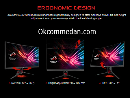 Asus XG32VQ memiliki kaki yang telah didesign secara ergonomic sehingga led monitor ini dapat kita memutar , mengatur ketinggian led monitor ( ditinggikan dan direndahkan ) dan ditekuk sesuai dengan sudut pandang masing masing pemakai.