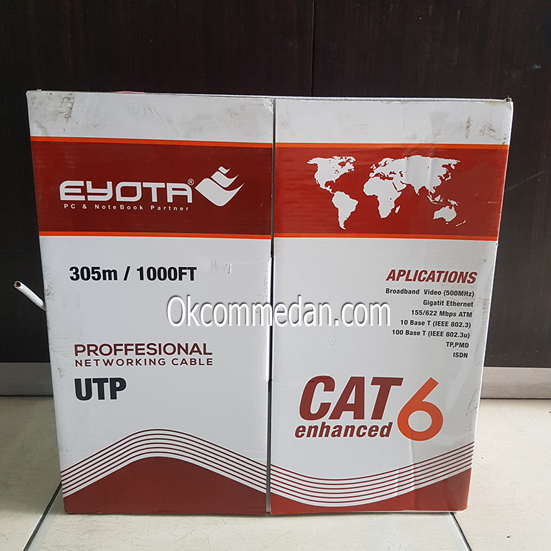 Kabel UTP Cat6 merek Eyota ini cocok dipakai untuk broadband video , Gigabit Ethernet , 155/ 622 Mbps ATM , 10 Base T ( IEEE 802.3 ) , 100 Base T ( IEEE 802.3u ) , TP, PMD , ISDN