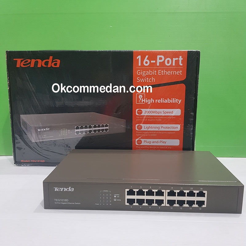 Tenda TEG1016d adalah Switch dengan 16 port 10/100/1000 Mbps auto negotiation Rj45 port dan mampu memberikan transmisi rate full duplex sampsi dengan 2000 Mbps.