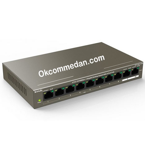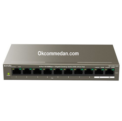 Tenda TEF1110P-8-102w merupakan Desktop Switch hub dengan 8 port Ethernet 10/100 Mbps yang mendukung PoE + 2 port Gigabit lan . Tenda TEF1110p ini menyediakan power 99 watt untuk keseluruhan ( 30 watt per port ) dan sanggup menarik kabel sampai dengan panjang 250 meter .