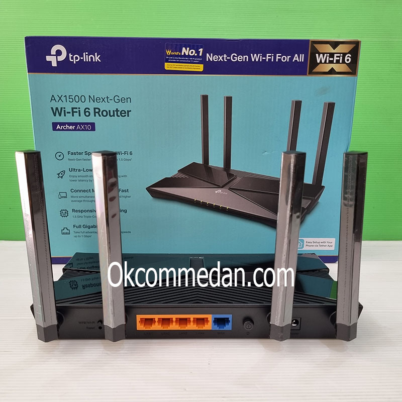 Tplink Archer AX10 adalah Wireless router Dual Band dengan teknologi Wi-Fi 6 yang terbaru yang kecepatannya bisa sampai 1.5 Gbps dan memiliki 4 Port Gigabit Lan serta 1 port Gigabit WAN.