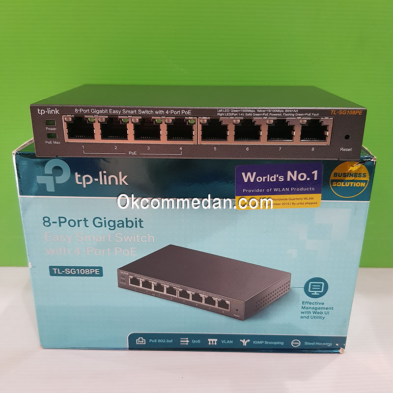 Tplink TL-SG108pe adalah Smart switch dengan 8 port Gigabit Rj45 dan 4 diantaranya adalah PoE port, sehingga data dan power dapat ditransfer dengan menggunakan sebuah kabel saja . PoE power pada tplink ini bisa mencapai 55 watt untuk semua portnya.