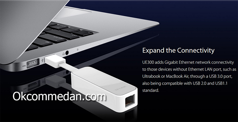 Dengan memakai Tplink UE300 maka Ultrabook maupun macbook air kita yang tidak memiliki port Ethernet Lan akan menjadi mempunyai Gigabit Ethernet Lan port yang dikonversi dari Port USB. Tplink ini mendukung untuk dipakai pada Port USB 3.0 , Port USB 2.0 dan juga Port USB 1.1.