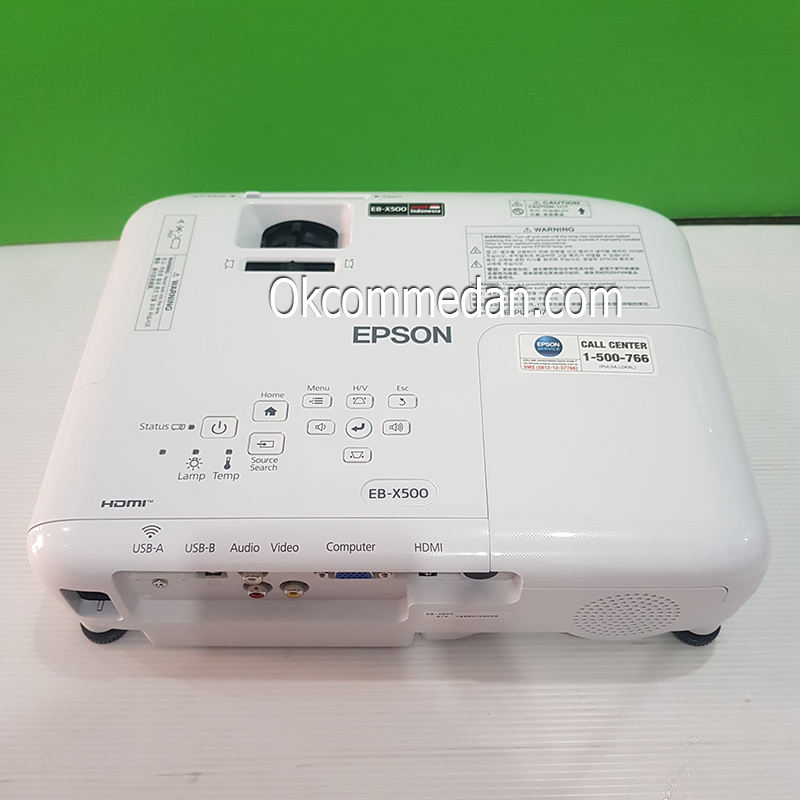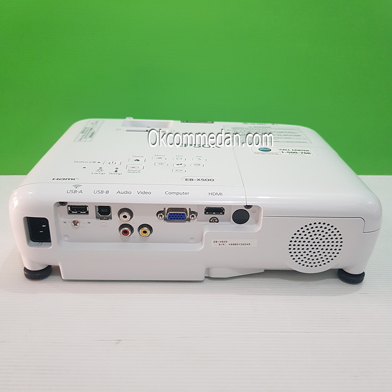 Projektor Epson EB X500 ini memiliki port interface yang lengkap seperti HDMI , VGA , USB A/b , RCA dan lensanya juga dilengkapi dengan penutup.
