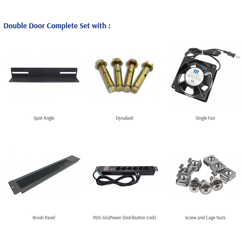 - Lengkap dengan : Glass Front door dan 2 pintu disamping dengan kunci / 1x Horizontal PDU 6 outlet dengan switch / 1x Kipas 220VAC / 1 Pcs Top Brush Panel / 4 pcs Dynabolt / 20 set Cagenuts dan screws.