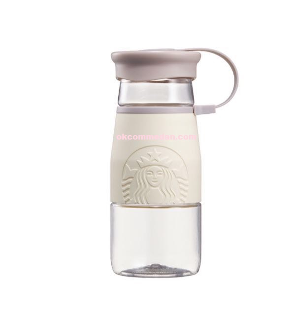 Starbucks tumbler botol ini merupakan tumber dengan bahan plastik transparan dengan bagian tengah warna putih dati bahan bebahan karet serta tutup warna pink.